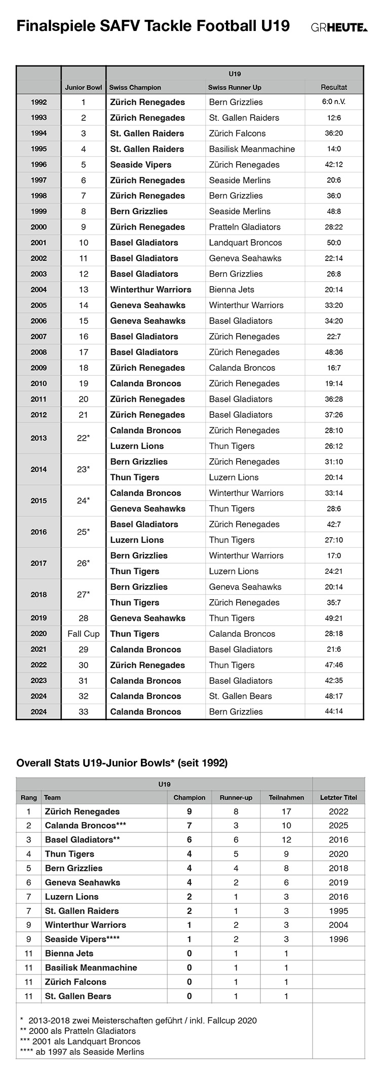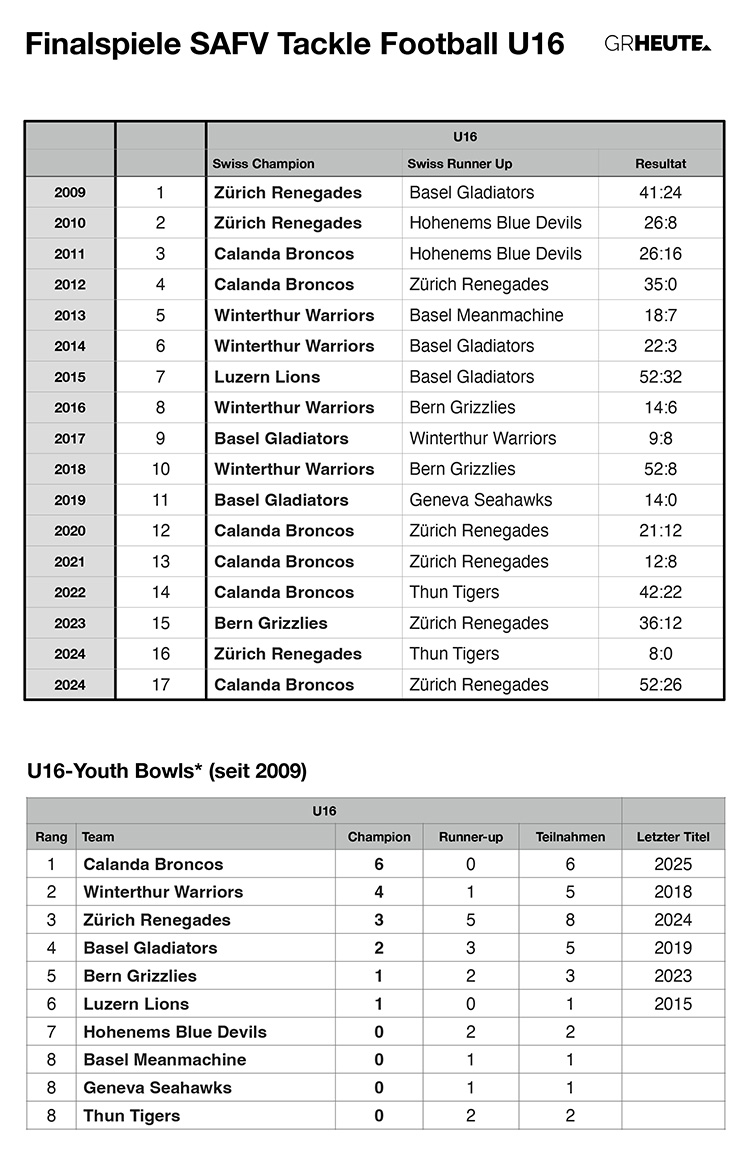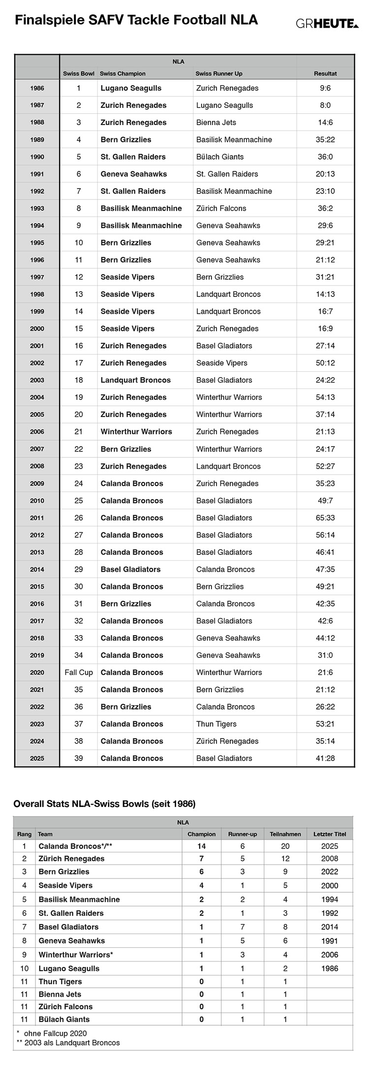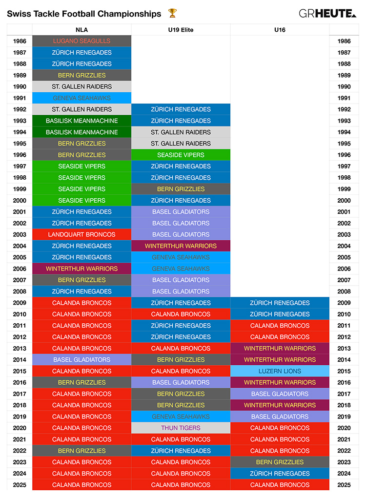 Die Statistiken zu den Schweizer Tackle-Football-Meisterschaften von 1986-2025.